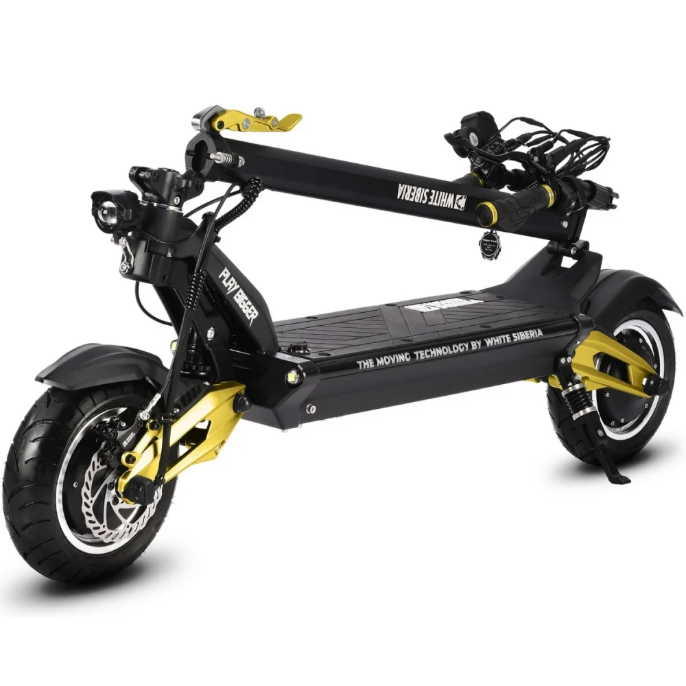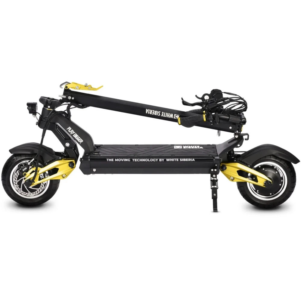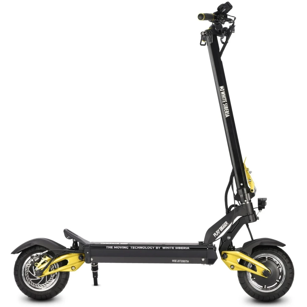 Электросамокат white siberia nerpa pro 3600w Gold – быстрый, полноприводный электросамокат от производителя бренда white Siberia. Siberia nerpa pro имеет электродвигатель мощностью 3600w (2 x 60v 1800w) и оснащен аккумулятором с 60V 24A, который заряжается за 6 ч. Данная модель nerpa pro является быстрым средством передвижения, версия pro может похвастаться отличными показателями скорости, а именно мощностью максимальной скоростью до 75км/ч с запасом хода до 70км, это один из самых мощных электросамокатов от данного производителя. Также новинку оборудовали отличными, гидравлическими дисковыми тормозами, размер колес – 11 дюймов, вес модели – 33 кг и максимальная нагрузка до 145 кг. Помимо того, что модель имеет хорошую скорость и набор отличных характеристик, она имеет прочный, легкий корпус из алюминия и подвеску с мощными регулируемыми амортизаторами, благодаря которым электросамокат может проехать любую преграду. Купить электросамокат white Siberia nerpa pro 3600w по хорошей цене можно на нашем сайте от производителя White Siberia.