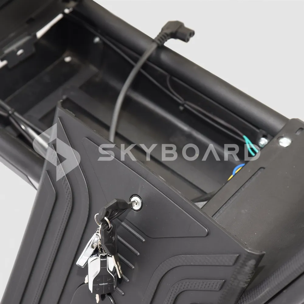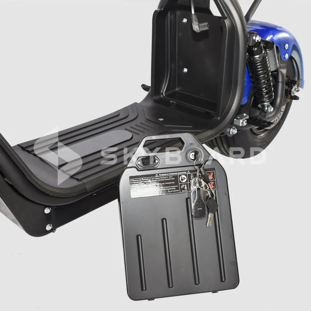 Встроенный аккумулятор 20А 60V заряжается от стандартной электросети через специальный кабель. При полностью заряженном аккумуляторе дальность беспрерывной поездки составляет порядка 45 км (при условии движения на максимальной скорости).