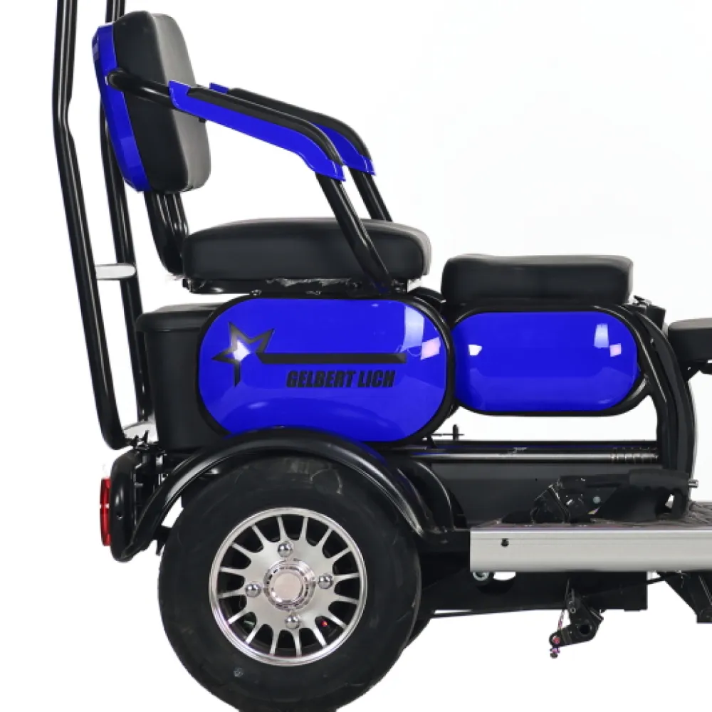 Электротрицикл Rutrike Gelbert Lich 48V/60V 600Вт – это современное средство передвижения, созданное для комфортных поездок по городу и за его пределами. Разработанный брендом Gelbert, этот электрический транспорт привлекает внимание своим стильным синим цветом и продуманной конструкцией, которая сочетает компактные габариты с надежной функциональностью.Двигатель мощностью 600 W, работающий при напряжении 48/60 V, обеспечивает плавное и стабильное ускорение, позволяя без труда преодолевать городские маршруты и небольшие подъемы. Несмотря на вес в 120 кг, электротрицикл демонстрирует высокую устойчивость благодаря оптимально подобранным 8‐дюймовым колесам, обеспечивающим хорошее сцепление с дорогой.Компактные размеры в собранном состоянии (178×76×103 см) делают этот трицикл маневренным даже в условиях узких улиц и оживленного трафика. Классическая барабанная тормозная система разработана для надежного и своевременного замедления, что повышает уровень безопасности при движении.Электротрицикл Rutrike Gelbert Lich не только функционален, но и эстетически привлекателен – синий оттенок корпуса подчеркивает его современный дизайн, а тщательно продуманные линии делают модель заметной и стильной. Это устройство идеально подходит для тех, кто ищет экологичное и экономичное транспортное средство для повседневных поездок, не теряя при этом в качестве и комфорте.Выбирая Rutrike Gelbert Lich, вы получаете надежное транспортное средство, способное сочетать динамичное передвижение, высокую маневренность и продуманную систему безопасности, что делает каждую поездку не только удобной, но и безопасной.