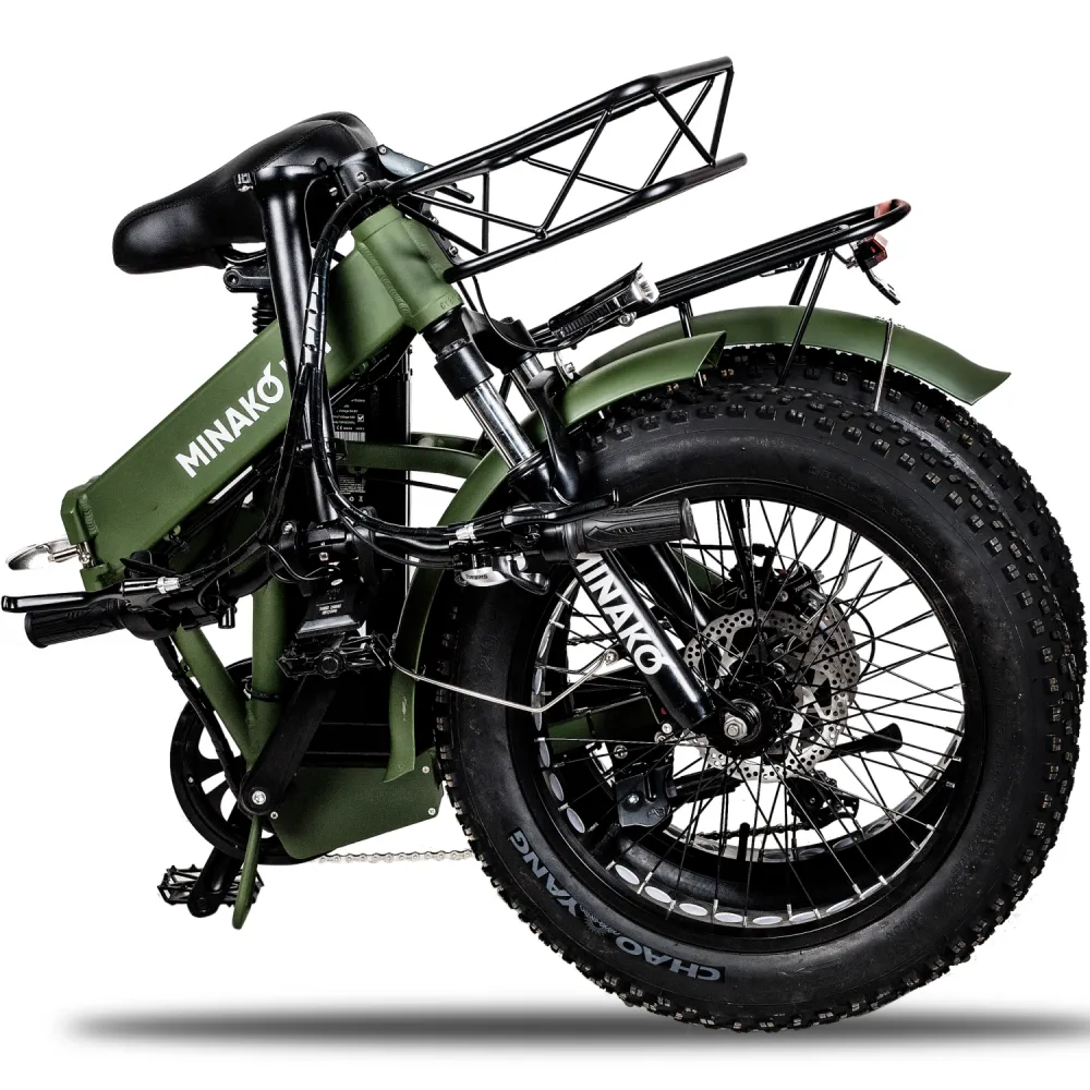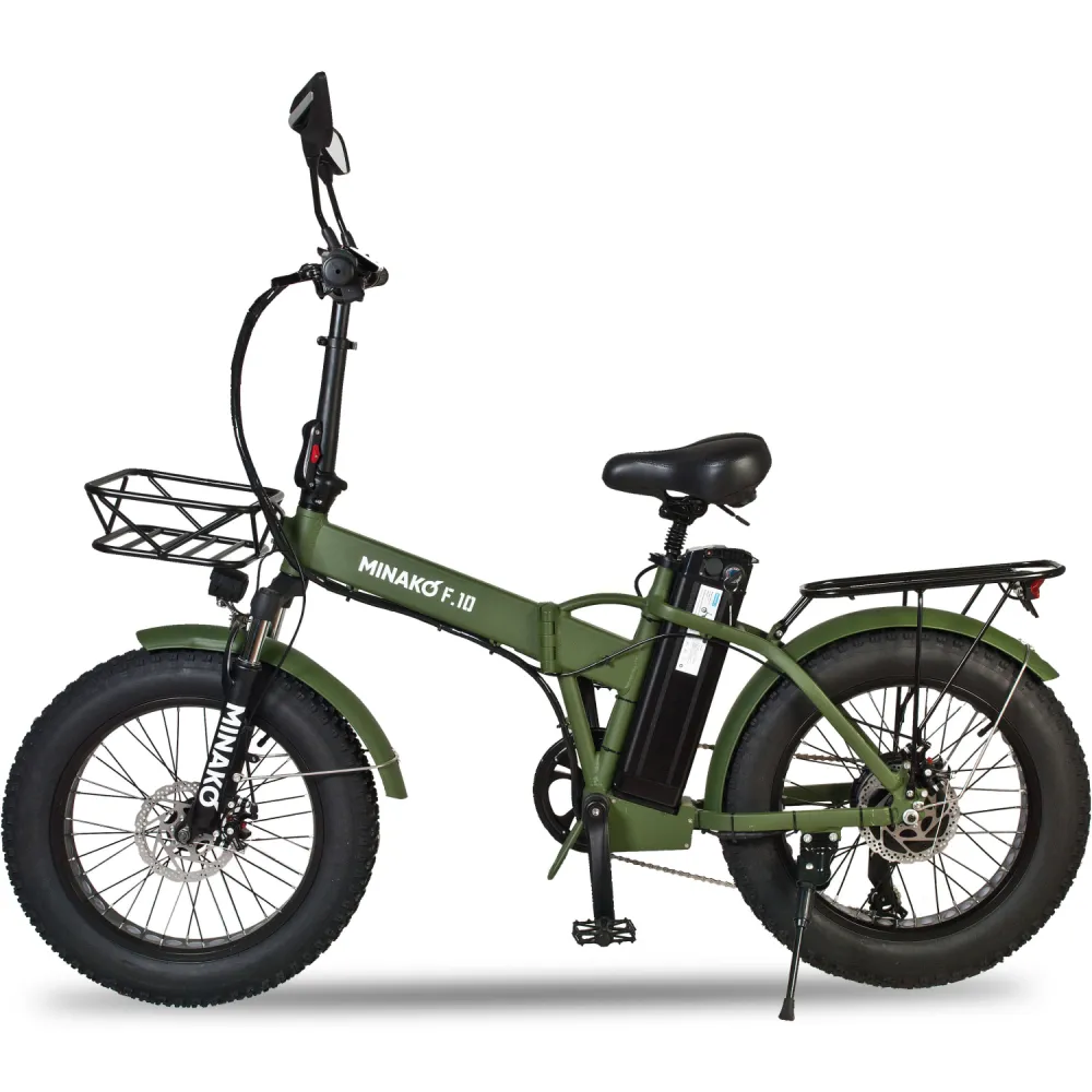 ЭЛЕКТРОВЕЛОСИПЕД MINAKO F10 хаки – выглядит круто и броско в сравнении с аналогичной техникой. При весе 27 кг модель рассчитана на грузоподъемность до 120 кг. Технические характеристики допускают эксплуатацию байка в городской и дачной местности. Для приобретения модели по приемлемой цене предлагаем сделать телефонный звонок менеджеру нашего интернет-магазина.