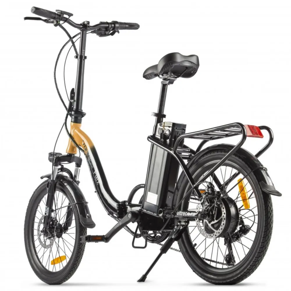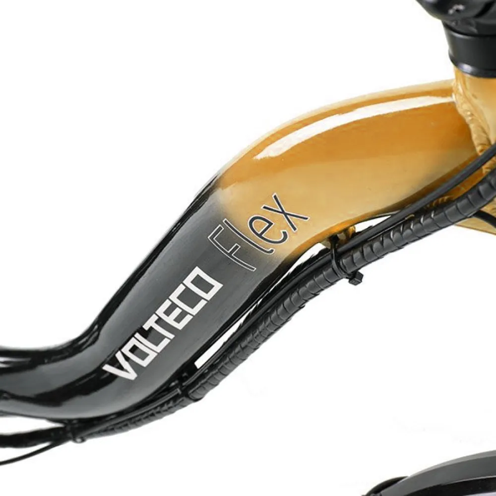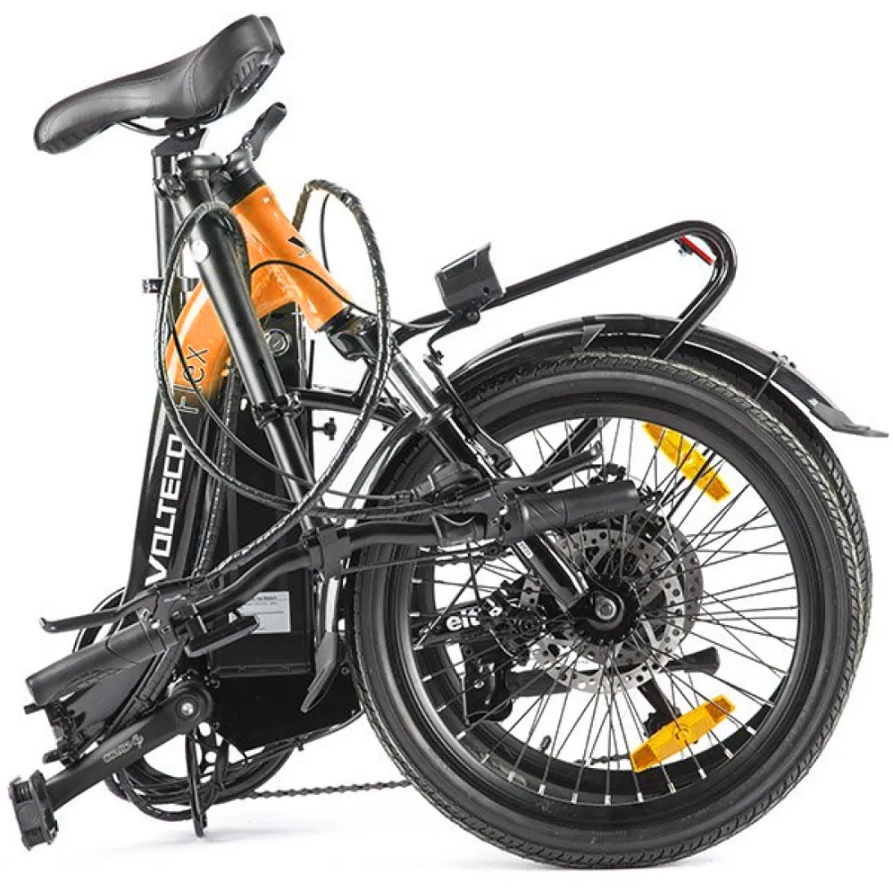 Электровелосипед VOLTECO FLEX черно-оранжевого цвета, представляет из себя простой на вид, но намного усовершенствованный на базе обычного предшественника. Только уже на нем установлен электрический привод, аккумуляторная батарея. Можно ездить с большим удовольствием, не затрачивая свои силы и энергию. При случаи, если заканчивается зарядка на аккумуляторе, можно легко перейти на педальное управление. Этот режим придает уникальности данной модели и выделяет из многообразного количества подобных средств передвижения.