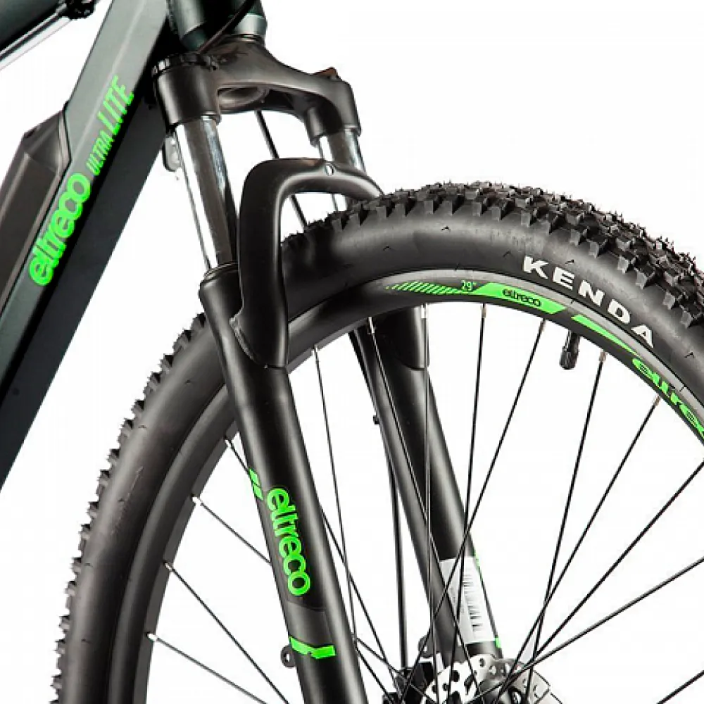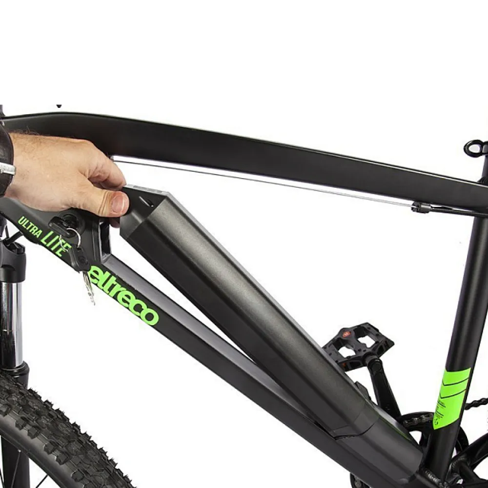 Электровелосипед Eltreco Ultra Lite в черно-зеленой расцветке включает в себя особенности, которые обеспечивают безопасность езды.