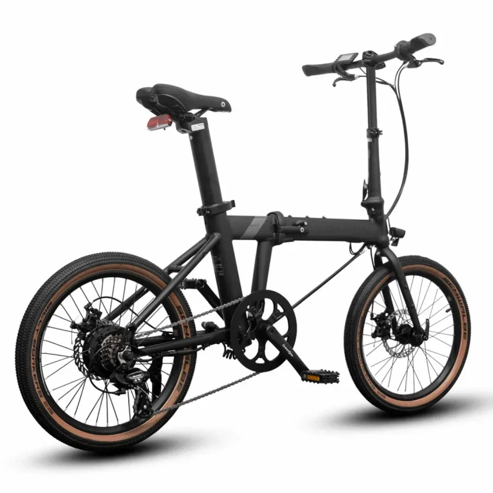 Алюминиевая рама обеспечивает лёгкость и прочность, руль 6061 Aluminum шириной 580 мм регулируется для комфорта, а подседельный штырь из алюминия фиксирует посадку. Аккумулятор Samsung 36V 9.5Ah даёт энергоэффективность благодаря литиевым ячейкам, влияющим на пробег до 40-50 км в эко-режиме (реальная дальность: 30-40 км в смешанном, 20-25 км на подъёмах или полной нагрузке). Механические дисковые тормоза DAHON и мотор 250W справляются с горками до 15% уклона и неровностями; режимы езды (Eco, Drive, Sport, если предусмотрены) регулируют скорость до 25 км/ч, повышая эффективность на 15-20% в эко. Быстрая зарядка отсутствует, стандартная — 4-6 часов с эффективностью 90%.
