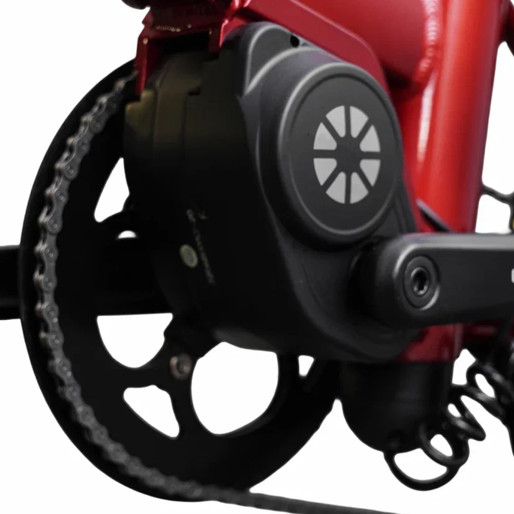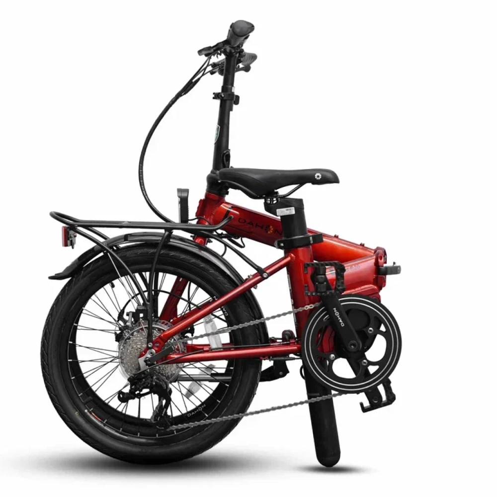 Складной электровелосипед DAHON UNIO E20 в красном цвете представляет собой легкий (12,2 кг) городской вариант с 20-дюймовыми колесами, подходящий для райдеров ростом 148-190 см. Алюминиевая рама обеспечивает прочность и компактность, делая его идеальным для ежедневных поездок и транспортировки в общественном транспорте. Модель сочетает механическую простоту с электрической поддержкой, фокусируясь на портативности без излишеств мощного мотора.