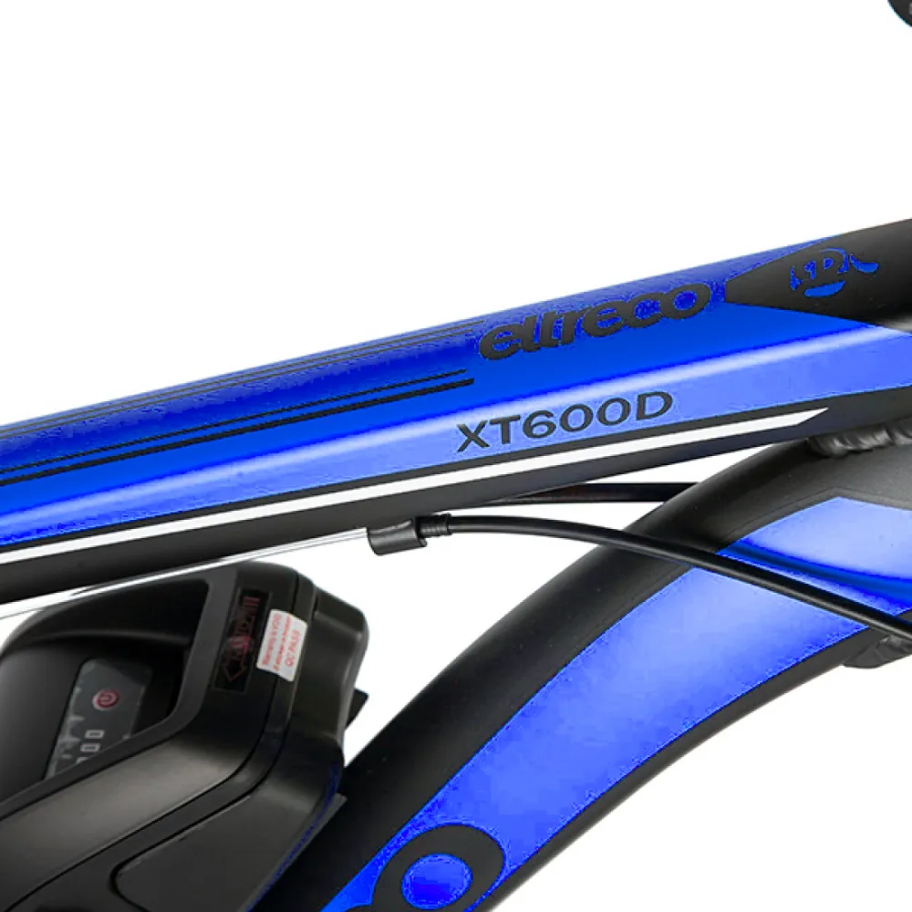 Велогибрид Eltreco XT 600 – доступная и востребованная на рынке электровелосипедов модель. В сравнении с предыдущими вариантами имеет облегченную алюминиевую раму, сглаженную геометрию, в которой нельзя найти острых углов. черно-синяя модель велосипеда сочетает в себе роскошь и многофункционал. Общий вес велика – 20 кг. При разработке модели производитель использовал оригинальные брендовые запчасти, что сделало срок службы техники длительным. Технические особенности электровелосипеда следующие: